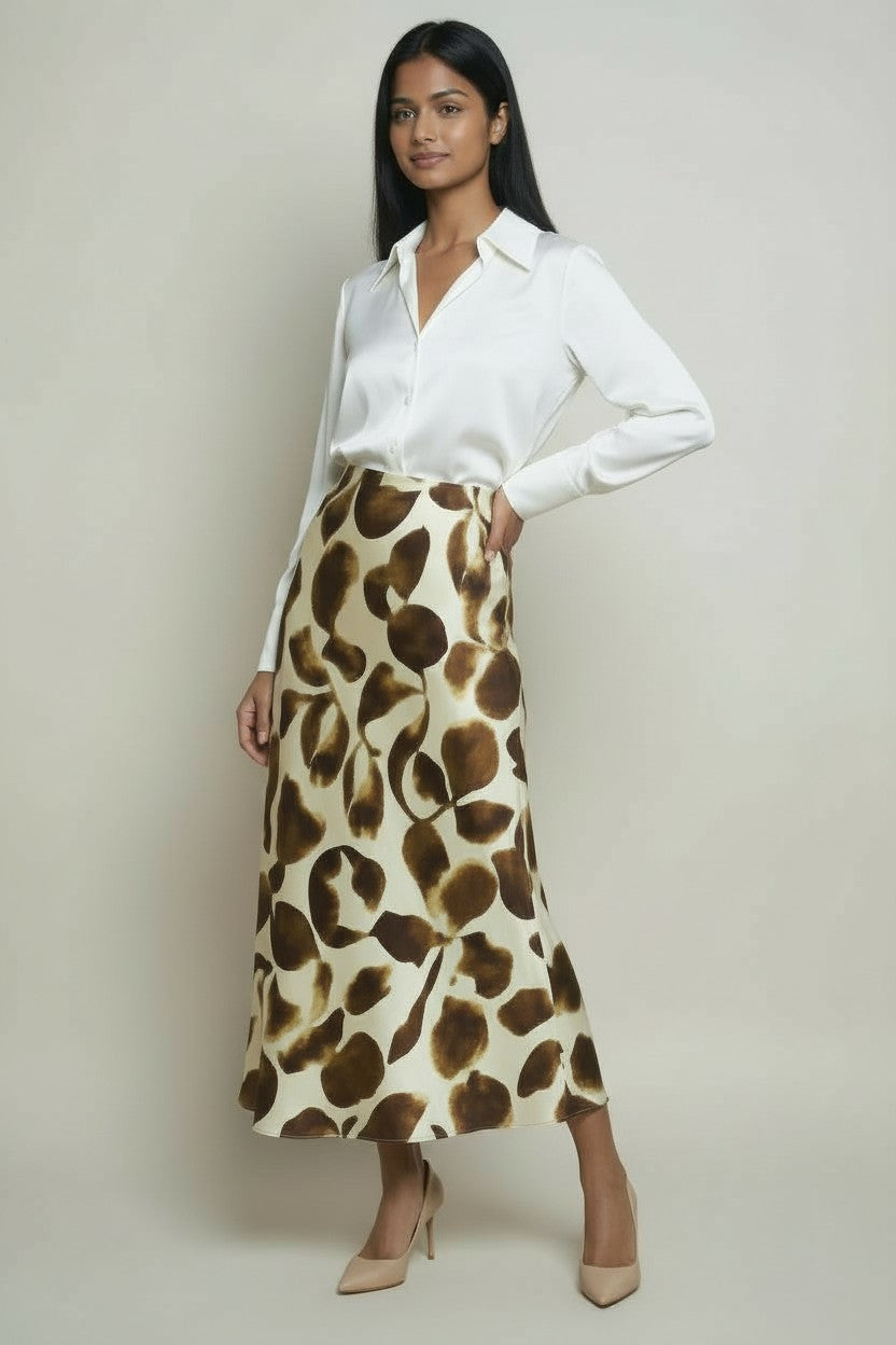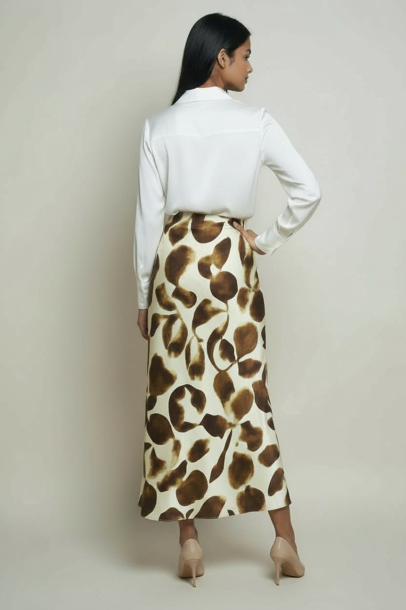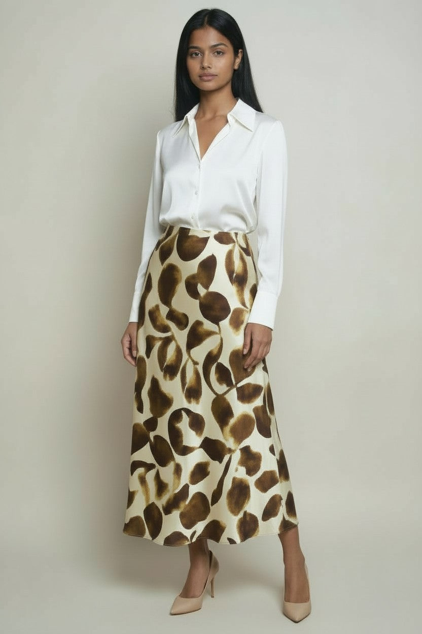 Conçue dans un satin léger au toucher soyeux, cette jupe présente un tombé fluide qui accompagne joliment le mouvement. Son imprimé blanc et marron crée un jeu visuel subtil, parfait pour des looks estivaux comme plus habillés.
