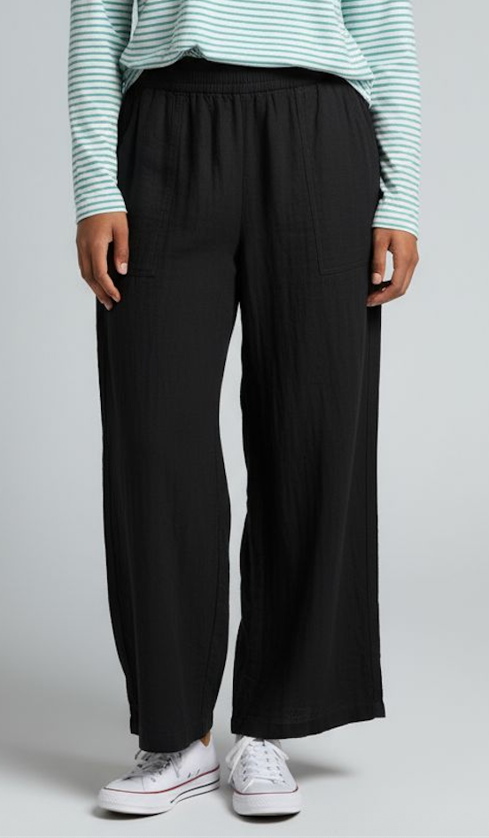 Design et style :Pantalon noir minimaliste à la coupe fluide et épurée, parfait pour la plage, les voyages ou les journées d’été. Son design sobre lui confère une allure décontractée et chic.